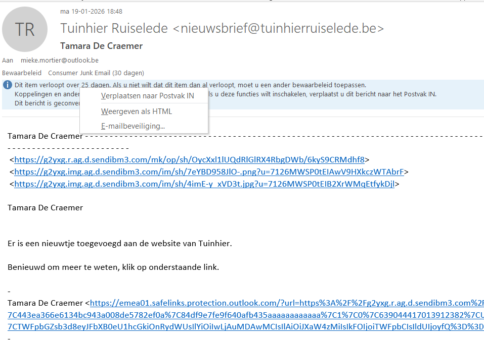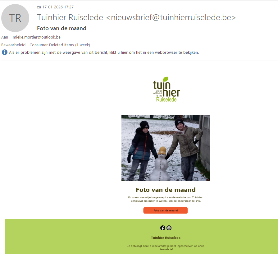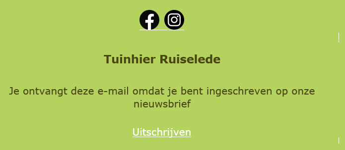 De Nieuwsbrief wordt verstuurd in naam van Tuinhier Ruiselede en zegt in het onderwerp waarover het gaat. Je kan eenvoudig doorklikken naar de website door het rode balkje aan te klikken