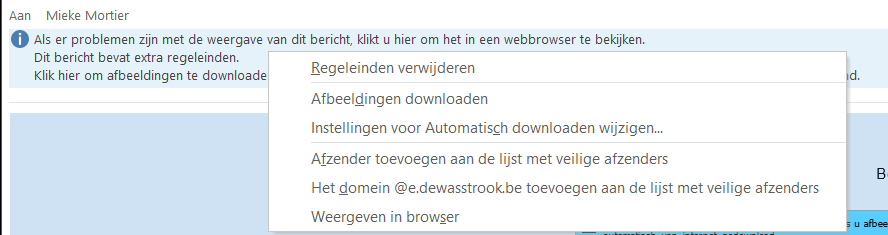 Eens je berichtje in je Postvak In zit klik je met je rechtermuisknop op ‘Als er problemen zijn…’ en selecteer ‘Afzender toevoegen aan de lijst van veilige afzenders’